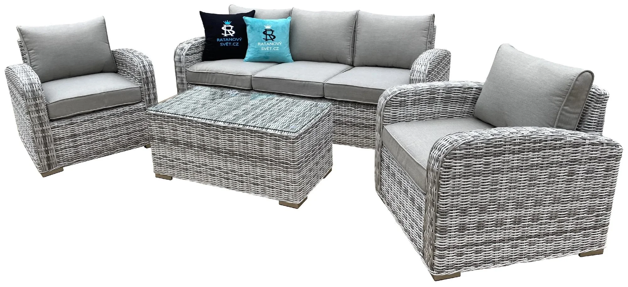 Souprava se skládá ze dvou křesel, prostorné pohovky a konferenčního stolku s odolným skleněným povrchem, což zajišťuje dokonalou harmonii a funkčnost pro jakýkoli venkovní i vnitřní prostor. SARAH II svým světle šedým provedením a mocca polstrováním přináší luxusní nádech do všech prostor, včetně domova či firemní recepce.