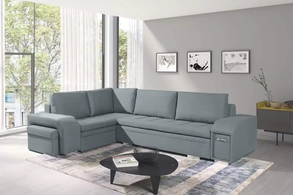 Sedací souprava Falco Alana L odkazuje na pohodlí a praktičnost jako na dva klíčové pilíře každé sestavy. Díky rozkládací funkci slouží i pro občasné spaní a vestavěné úložné prostory lze využít v područi, v taburetu i v sedací části. Celá souprava je celočalouněná a proto ji lze umístit i do volného prostoru bez nutnosti opěrky k zdi. Komfort zvyšují pružiny v kombinaci s kvalitní PUR pěnou, zatímco velké opěrné polštáře zajišťují skvělé podepření zad. Vzor látky, která bude dodána, je viditelný na doplňkových fotografiích; odstín se může lehce lišit podle světla. Doplňky a dekorace na ilustracích nejsou součástí ceny. Rozměry uvedené pro tuto sedací soupravu jsou: šířka 205 cm, délka 305 cm, výška 90 cm, výška sedu 42 cm, výška područe 56 cm, výška opěrky 53 cm a hloubka sedu 56 cm. Rozkládací plocha po rozložení činí 150 x 250 cm a hmotnost soupravy dosahuje zhruba 200 kg. Záruční doba činí 2 roky.