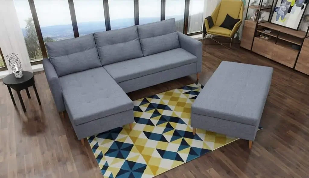Pro pohodlí se zde spojuje pružinový systém s kvalitní PUR pěnou a tři velké opěrné polštáře. V ceně je velký taburet s úložným prostorem, který poslouží jako další místo k sezení a dá se jej přisunout k sedačce pro občasné spaní hostů. Sedačku nabízíme v kvalitní potahové látce. Materiály jsou odolné a snadno udržovatelné, takže sedací souprava dlouho zachová svůj vzhled a pohodlí. Vyobrazené doplňky a dekorace nejsou součástí ceny.