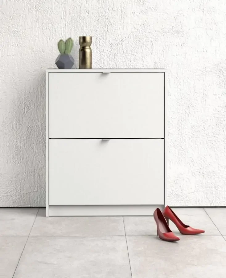 Udržte předsíň uklizenou díky botníku Flap 001 s výklopnými dvířky, který lze umístit na podlahu i zavěsit na stěnu podle prostoru. Barva provedení je bílá, což usnadňuje sladění s většinou interiérů. Jeho konstrukce z odolného lamina je snadná na údržbu a dlouho vydrží. Botník je dodáván v demontovaném stavu a v balení najdete návod spolu se všemi spojovacími prvky pro rychlou montáž.
