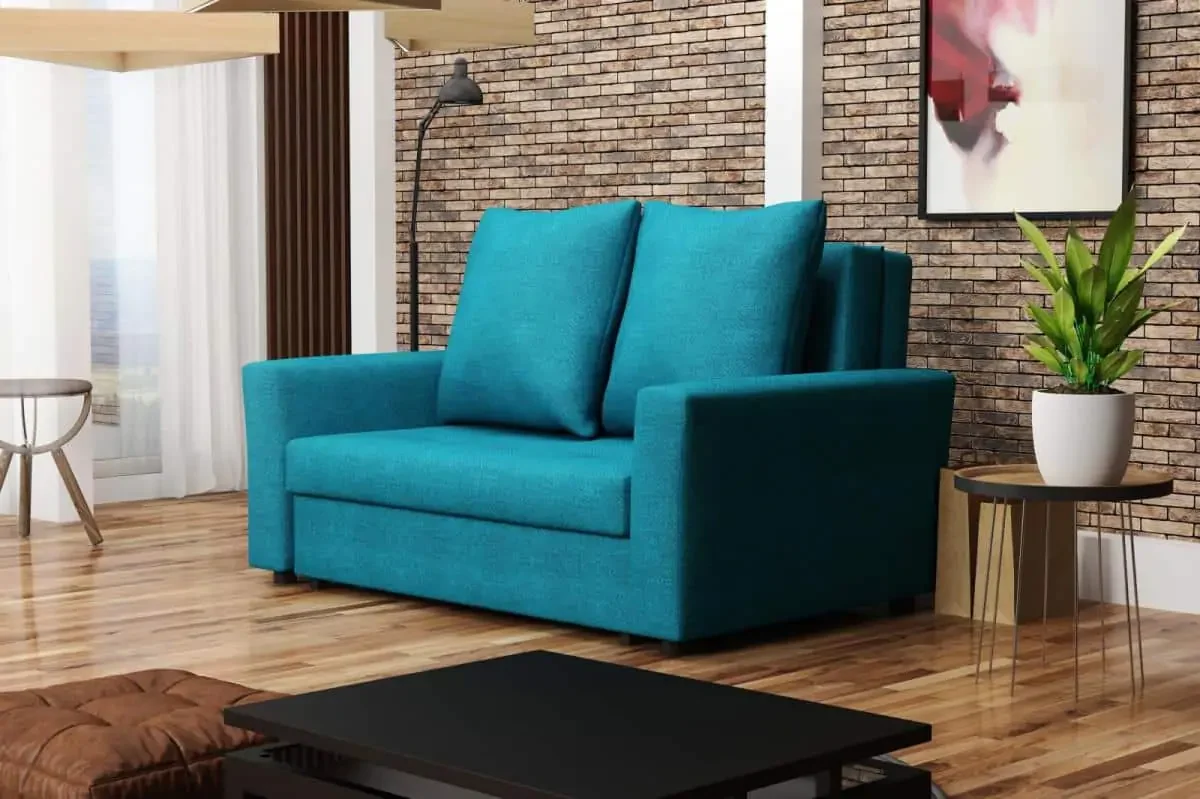 Rozkládací křeslo Elis od Falco v tyrkysové barvě je praktickým společníkem do menších prostor. Po rozložení poskytuje lůžko o rozměrech 115x198 cm a sedací část s pružinovým systémem a PUR pěnou slibuje pohodlí jak při posezení, tak při spaní.