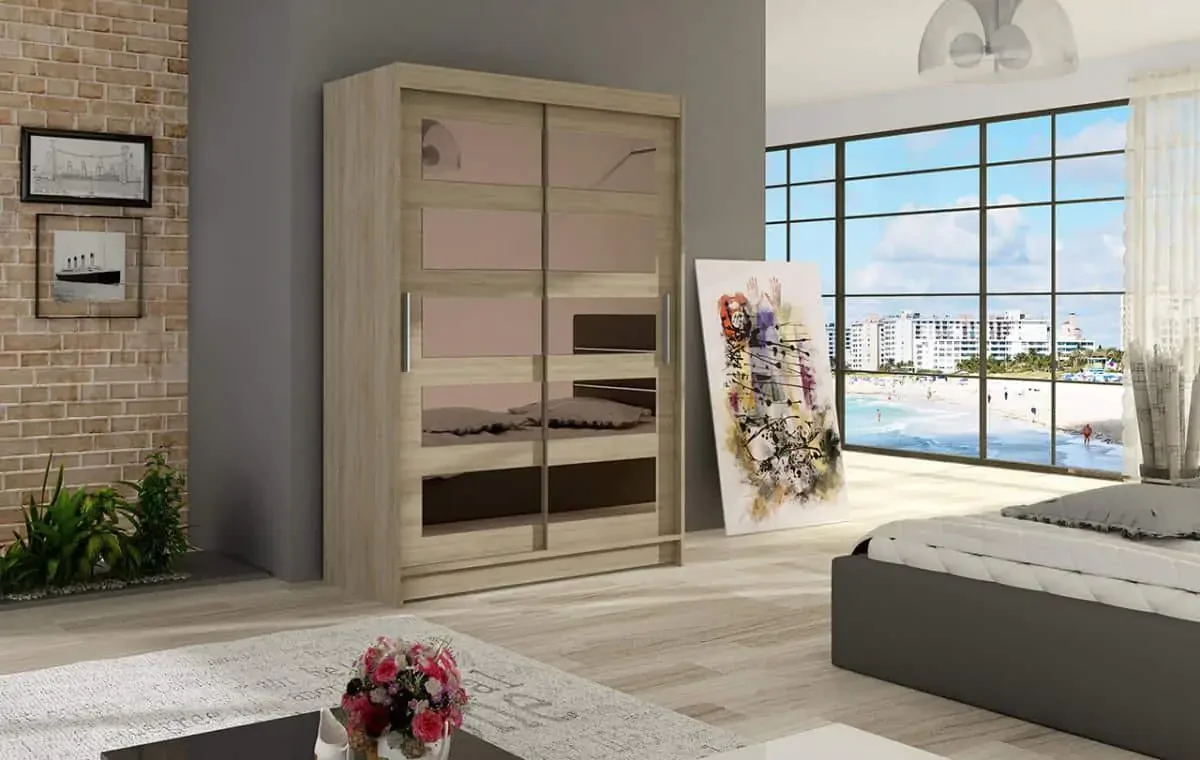 Moderní a elegantní provedení skříně osloví i náročné zákazníky díky čistým liniím a stylovému vzhledu. Dveře zdobí kouřová zrcadla, která dodávají prostoru hloubku a lehký lesk.