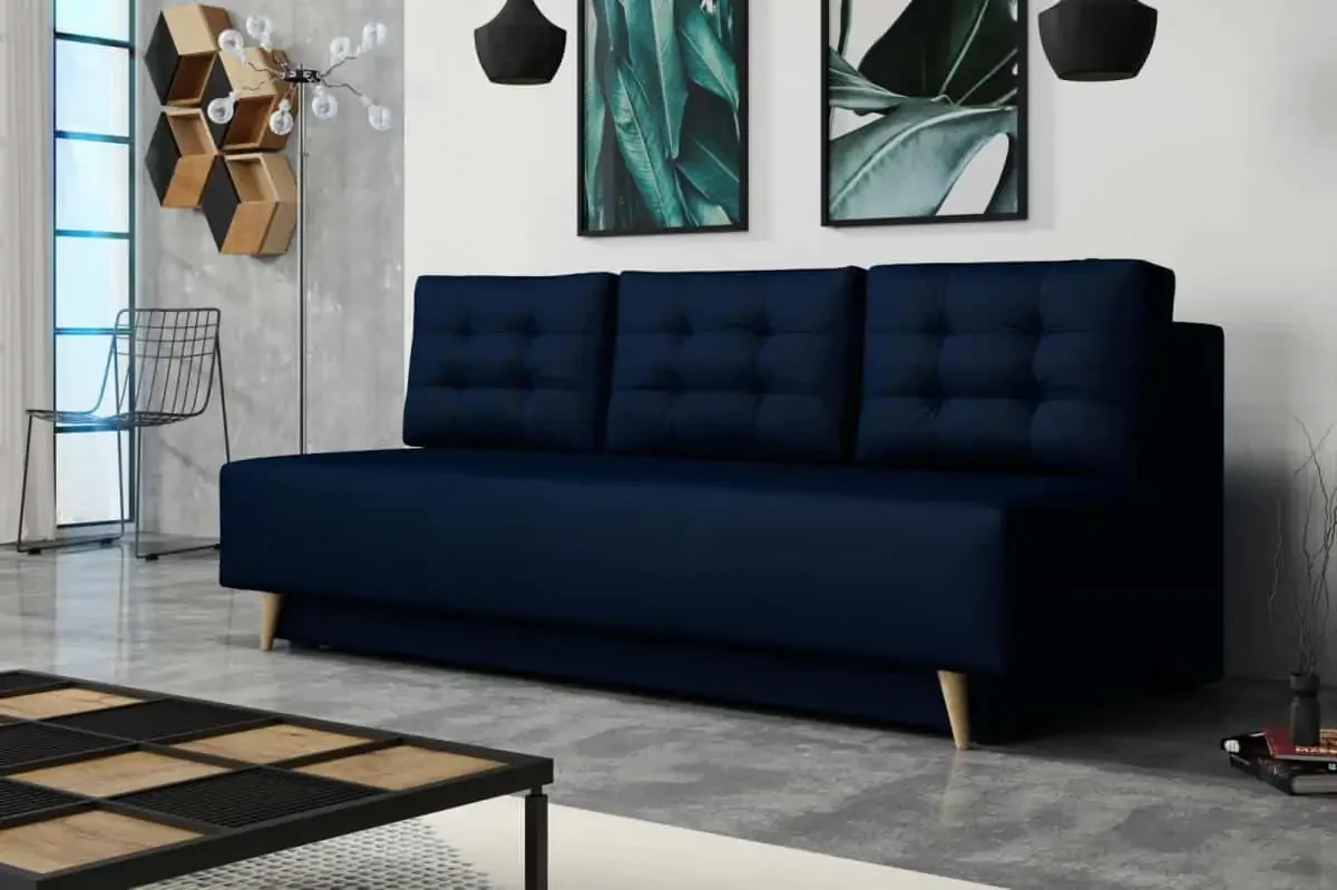 Pohovka Sebastian v modré variantě velluto spojuje nadčasový retro styl s komfortním posezením pro každodenní použití. Retro šarm zdobí šikmé dřevěné nohy a prošívání knoflíky na opěráku, přičemž celočalouněná konstrukce umožňuje její umístění i do volného prostoru. Rozkládací mechanismus s integrovaným úložným prostorem snadno vytvoří prostorné lůžko o ploše 142 x 200 cm pro občasné přespání hostů. Výplň sedáku tvoří kombinace pružin Bonnell a kvalitní PUR pěny, která zajišťuje dobrou oporu a komfort při sezení i spaní. Rozměry: výška 71 cm (bez polštářů), výška sedu 43 cm, délka 200 cm a hloubka 87 cm; záruka 2 roky. Dekorativní prvky na fotografiích nejsou součástí nabídky.