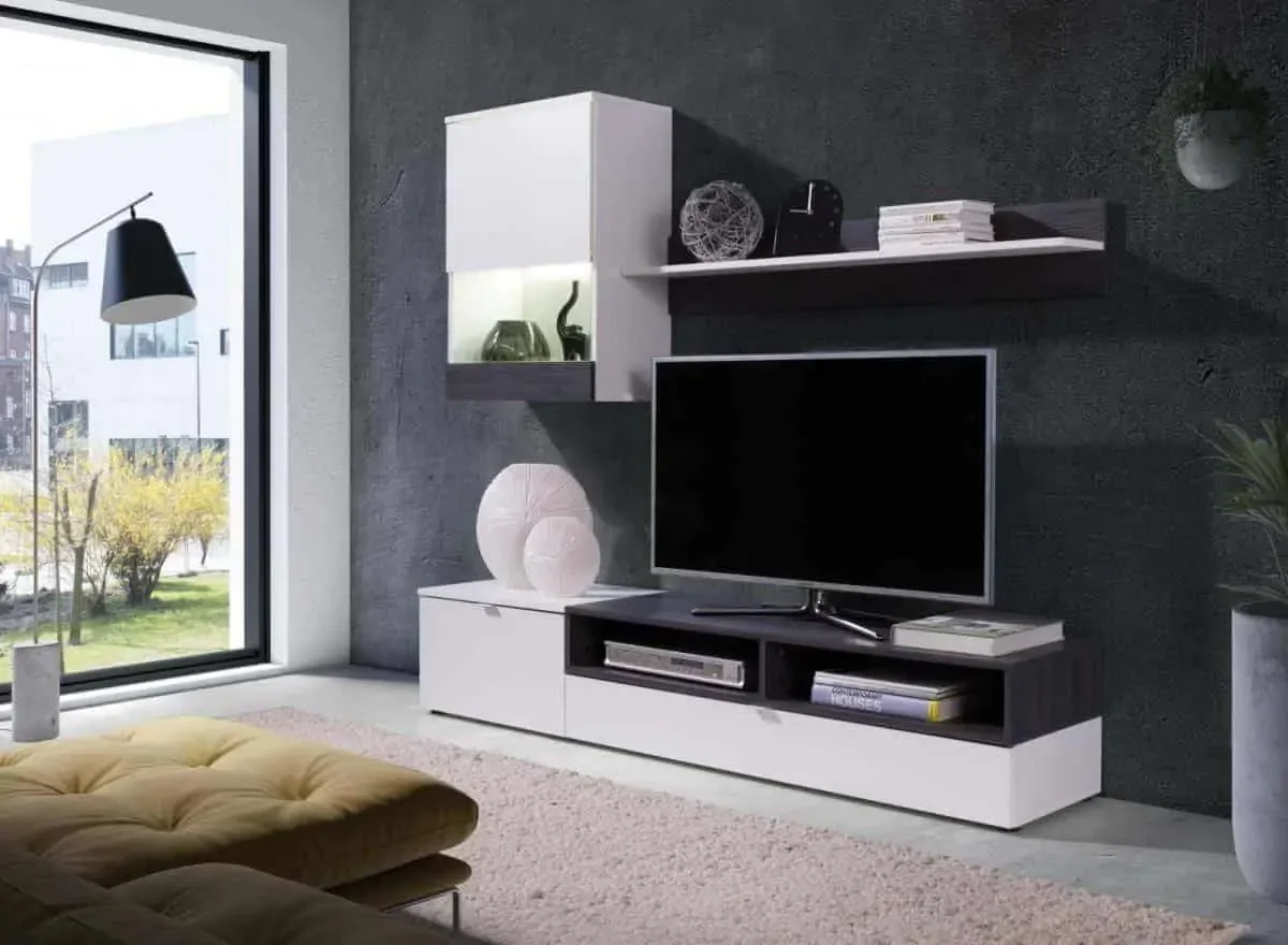 Obývací stěna Robin je vyrobena z odolného lamina, které je odolné proti poškrábání a snadné na údržbu, takže údržba je rychlá a bez námahy. Díky svým rozměrům je vhodná i pro menší byty a garsoniéry, kde poskytuje praktické úložné prostory a zároveň estetický vzhled. Do vitríny lze doplnit LED osvětlení, avšak toto příslušenství není součástí balení. Všechny díly jsou dodávány v demontu a součástí je podrobný montážní návod spolu s potřebným spojovacím materiálem; na ukázkových fotografiích zobrazené doplňky a dekorace nejsou součástí produktu. Rozměry (v/š/hl): TV stolek 34 cm × 175 cm × 39 cm; závěsná vitrína 77 cm × 55 cm × 31 cm; police 20 cm × 120 cm × 20 cm. Jednoduchá montáž a variabilita uspořádání dle prostoru činí z této sestavy praktické řešení pro útulný a stylový domov, který působí svěže díky kombinaci bílé barvy a tmavého dřeva.
