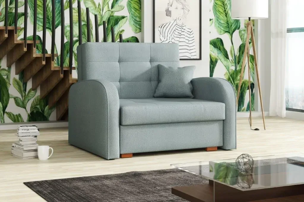 Rozkládací křeslo Vivian je skvělým řešením pro menší prostory a snadno se hodí do dětského, studentského či hostinského pokoje. Díky snadnému rozložení vznikne komfortní lůžko pro občasné přespání návštěvy. Sedací část kombinuje vlnité pružiny s PUR pěnou, které zajišťují stabilní oporu a pohodlí při sezení i spaní. Potah v modro-šedém odstínu je vyroben z kvalitní látky a křeslo navíc nabízí praktický úložný prostor pro deku a polštář. V ceně je jeden dekorační polštář; ostatní dekorace na fotografiích nejsou součástí nabídky. Zobrazené barvy na fotografiích se mohou mírně lišit od skutečnosti. Rozměry: výška 85 cm, šířka 102 cm, hloubka 98 cm; plocha pro rozložení 80x196 cm. Hmotnost cca 50 kg a záruka 2 roky. Navíc díky odolnému materiálu se křeslo snadno čistí a dlouhodobě si udrží svůj vzhled i funkčnost.
