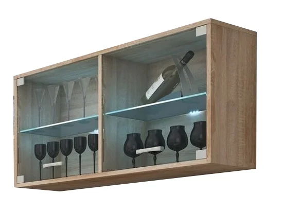 Prosklená závěsná skříňka v odstínu dub sonoma světlý spojuje praktičnost s jemnou elegancí. Je vyrobena z lamina tloušťky 16 mm s ABS hranou 0,6 mm, což zaručuje odolnost a snadnou údržbu.