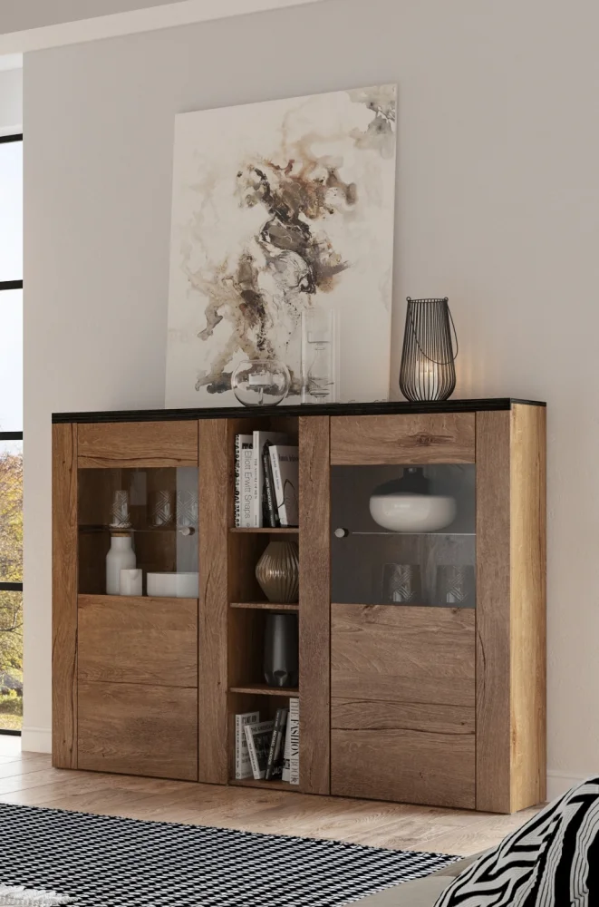 Elegantní vitrína Fedra 2D v provedení dub Lefkas a touchwood vnese do každé místnosti moderní vzhled. Rozměry uváděné jako šířka 155 cm, hloubka 37 cm a výška 130 cm poskytují dostatek místa pro vystavení i ukládání věcí.