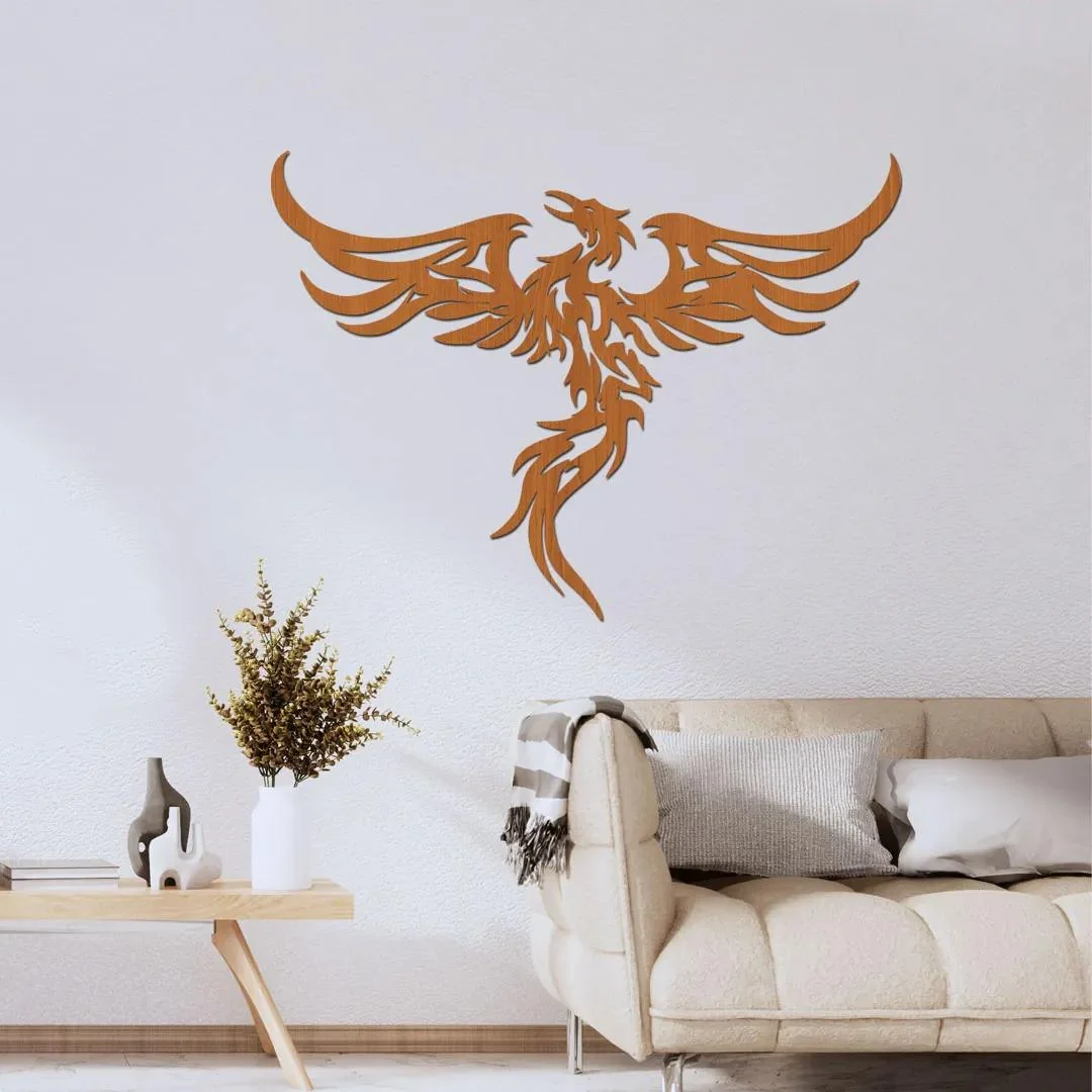 Dřevěná nástěnná dekorace s motivem létajícího Fénixe symbolizujícího věčný život, proměnu a nové začátky. Vyrobena z kvalitního ekologického HDF materiálu, který nabízí vysokou pevnost, detailní laserové vyřezávání a široké možnosti barevného sladění s vaším interiérem.