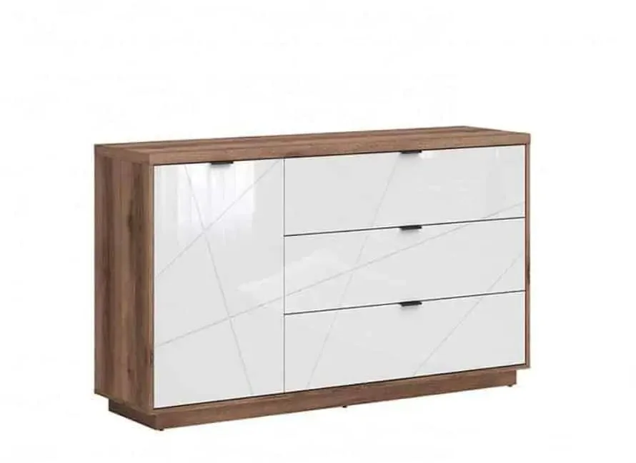 Moderní komoda FORN KOM1D3S kombinuje dub delano tmavý s bílým leskem, čímž vytváří luxusní a současný vzhled obývacího prostoru. Praktický úložný systém nabízí přehledné zásuvky a tichý, plynulý dojezd, který zajišťuje tichý chod při každodenním používání.