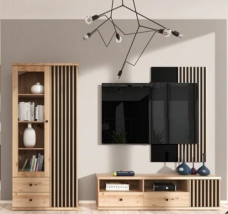 FRAGILIS je modulární obývací sestava v provedení dub artisan/černá, která umožňuje flexibilní uspořádání dle prostoru a stylu. Součástí sestavy je dekorativní závěsný panel, televizní stolek a vitrína; každý díl lze kombinovat podle potřeby a vytvořit tak skladbu přesně na míru.