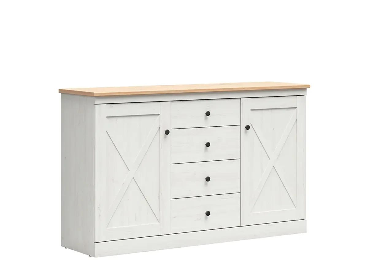 Komoda Frija KOM2D4S v čistém skandinávském stylu je vyrobená z kvalitní laminátové desky v dekoru bílé borovice Andersen a dub Artisan, což působí svěže a přírodně. Tento vzhled dodává prostoru jednoduchost i nadčasový vzhled, který se hodí do různých interiérů.
