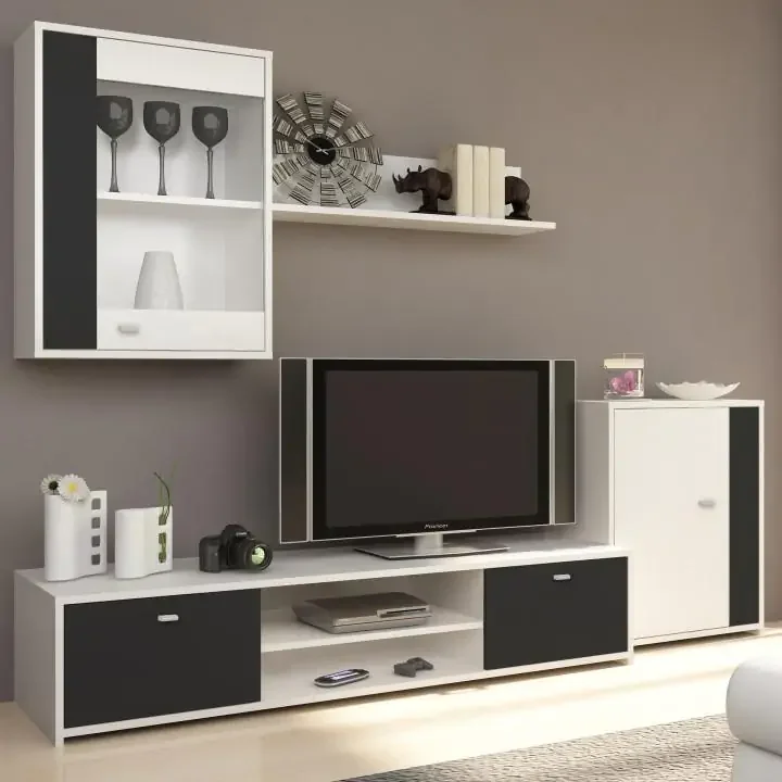 GENTA Obývací stěna zahrnuje televizní stolek, skříňku, polici a závěsnou vitrínu, které dohromady tvoří praktický úložný systém do obývacího pokoje. Je vyrobena z laminované dřevotřískové desky s ABS hranami, což zajišťuje dlouhou životnost a snadnou údržbu.