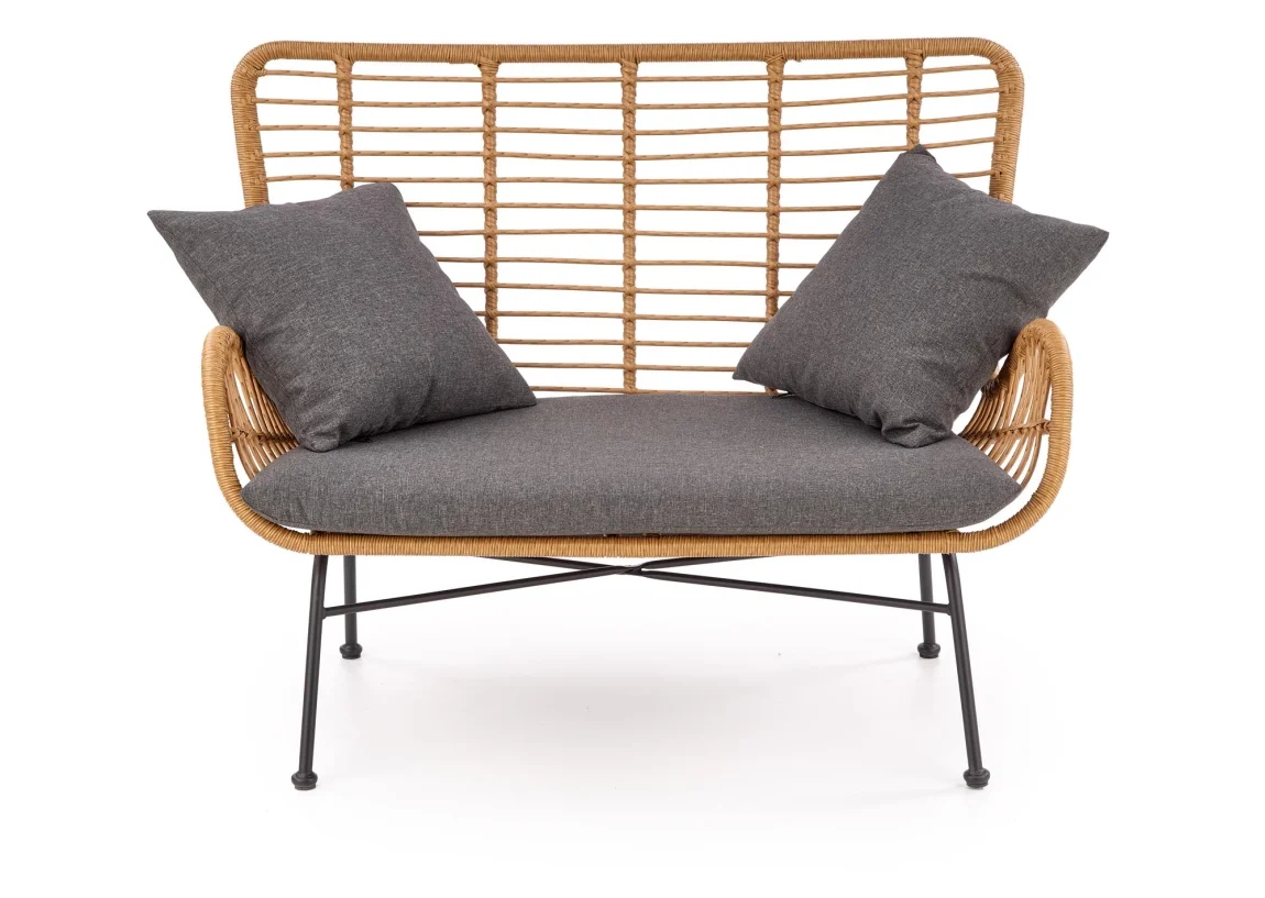 Sedák a opěradlo jsou vyrobeny z umělého ratanu, zatímco rám tvoří lakovaná černá ocel, která zajišťuje stabilitu. Čalounění v šedé barvě a nadčasový design se skvěle hodí jak na zahradu či terasu, tak do moderního obývacího pokoje. Umělý ratan byl navržen tak, aby vydržel odolný vůči povětrnostním vlivům a usnadnil údržbu. Dodáváno v demontu.