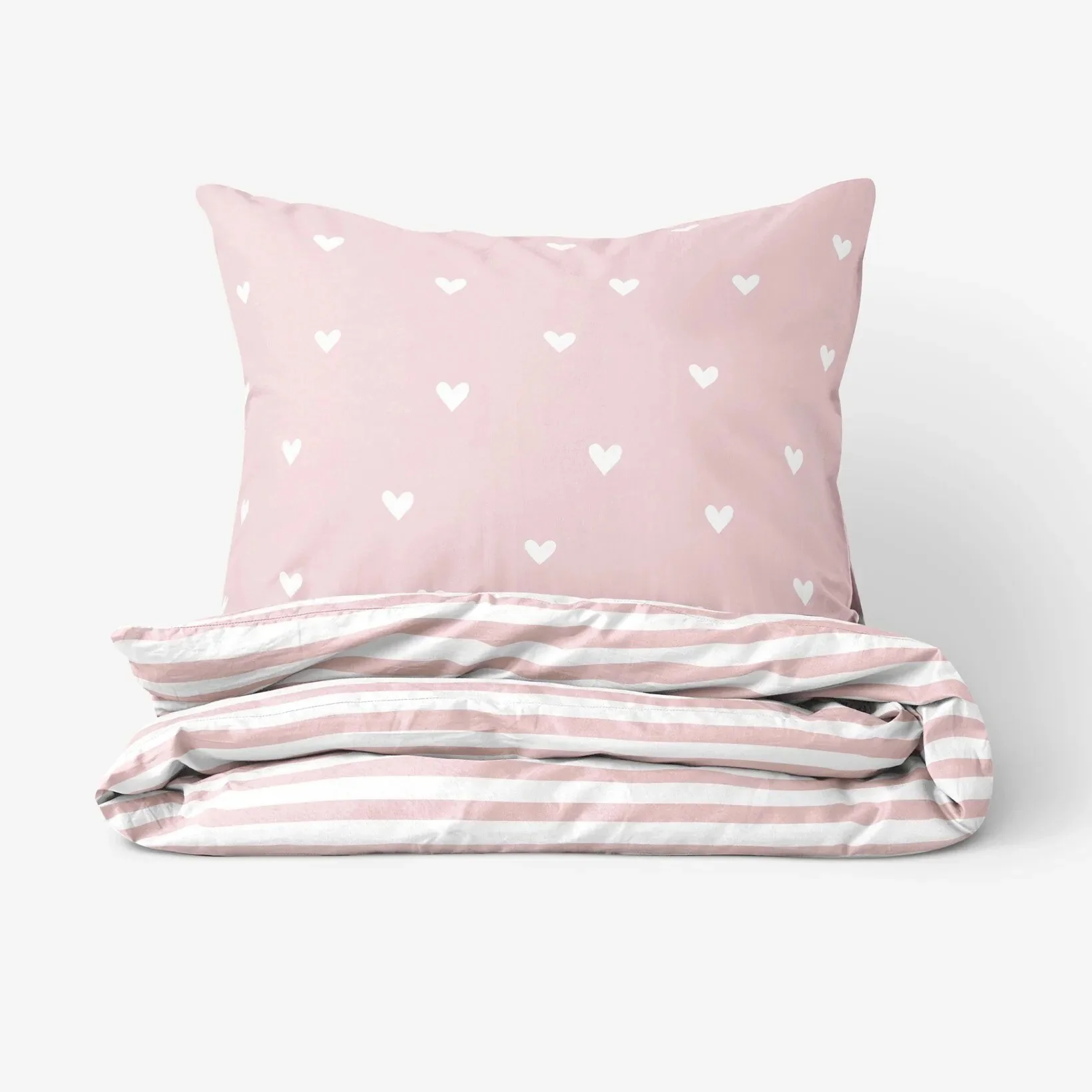 Vdechněte své ložnici romantickou atmosféru s povlečením zdobeným bílými srdíčky na jemném pudrově růžovém podkladu. Vyrobeno ze 100% hladké bavlny s hustotou 145 g/m², toto povlečení je nejen krásné, ale i příjemné na dotek a zajišťuje vám přírodní prodyšnost během celou noc.