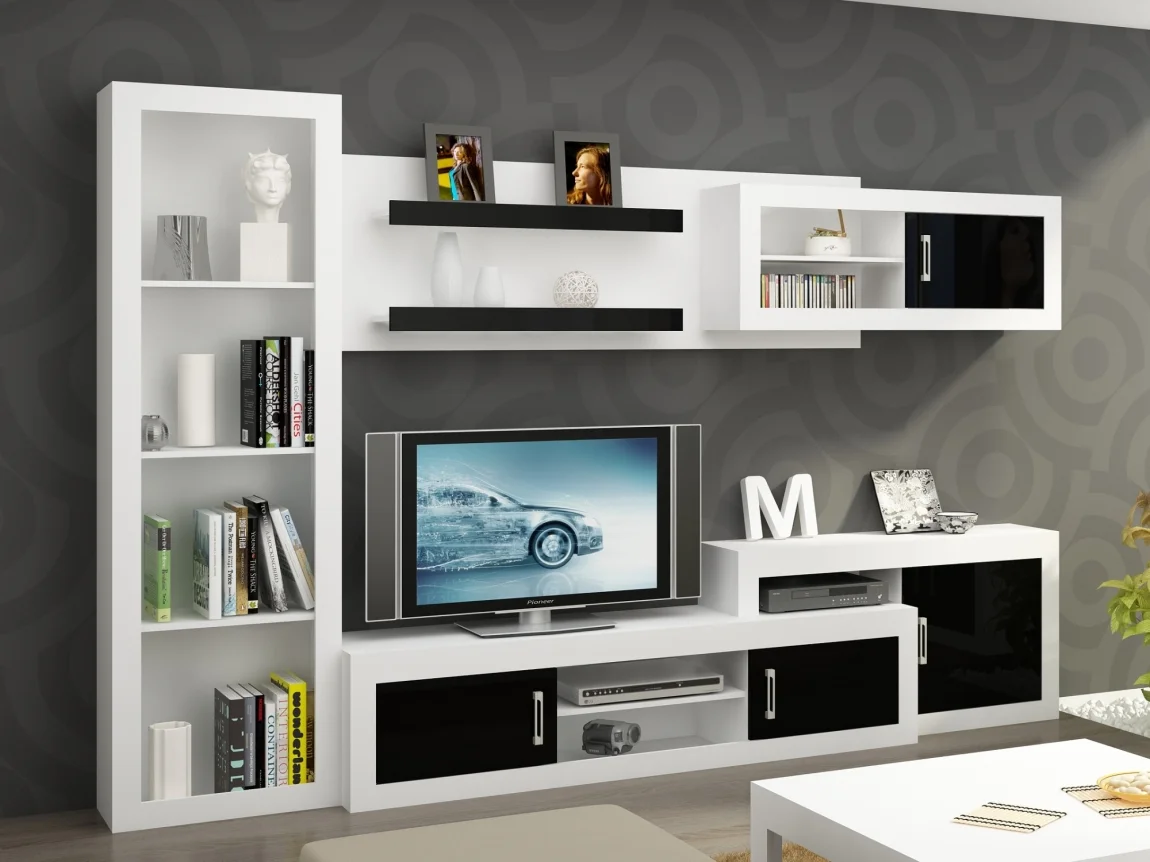 Obývací stěna GOUDINI 6 kombinuje svěží bílé provedení s černým leskem a díky laminu o síle 16 mm působí bytelně. Sestava zahrnuje RTV stolek 180 x 44 x 44 cm, nízký regál 120 x 65 x 34 cm, závěsnou skříňku 240/260/270 x 58 x 34 cm s volitelnou šířkou a regál 60 x 198 x 22 cm.