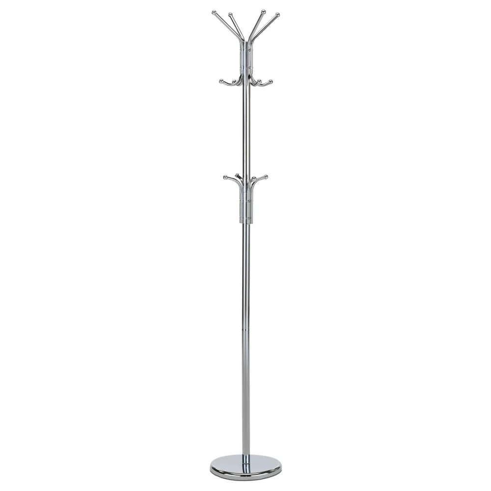 Moderní stojanový věšák s chromovou povrchovou úpravou nabízí dvě výškové úrovně háčků pro snadné pověšení kabátů, šálů a doplňků. Nosnost až 10 kg zajistí pevné zavěšení běžných věcí.
