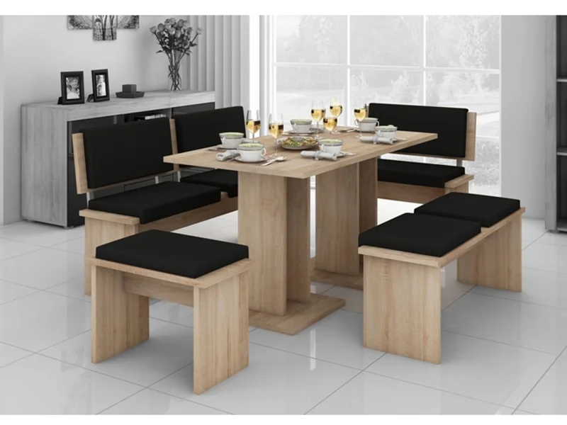 Jídelní set GURLAN v kombinaci světlého dubu sonoma a černé ekokože představuje prostorné řešení pro rodinné stolování. Deska stolu je vyrobena z lamina tloušťky 16 mm s ABS hranami 0,6 mm, což zajišťuje dlouhou životnost a snadnou údržbu. Součástí balení jsou lavice o rozměrech 75 × 83 × 47 cm a 150 × 83 × 47 cm, prostorný stůl 150 × 75 × 75 cm a dva taburety 120 × 48 × 38 cm a 60 × 48 × 38 cm. Dodává se v demontu, což usnadňuje montáž doma. 5letá záruka garantuje dlouhodobou spolehlivost a bezstarostné používání.