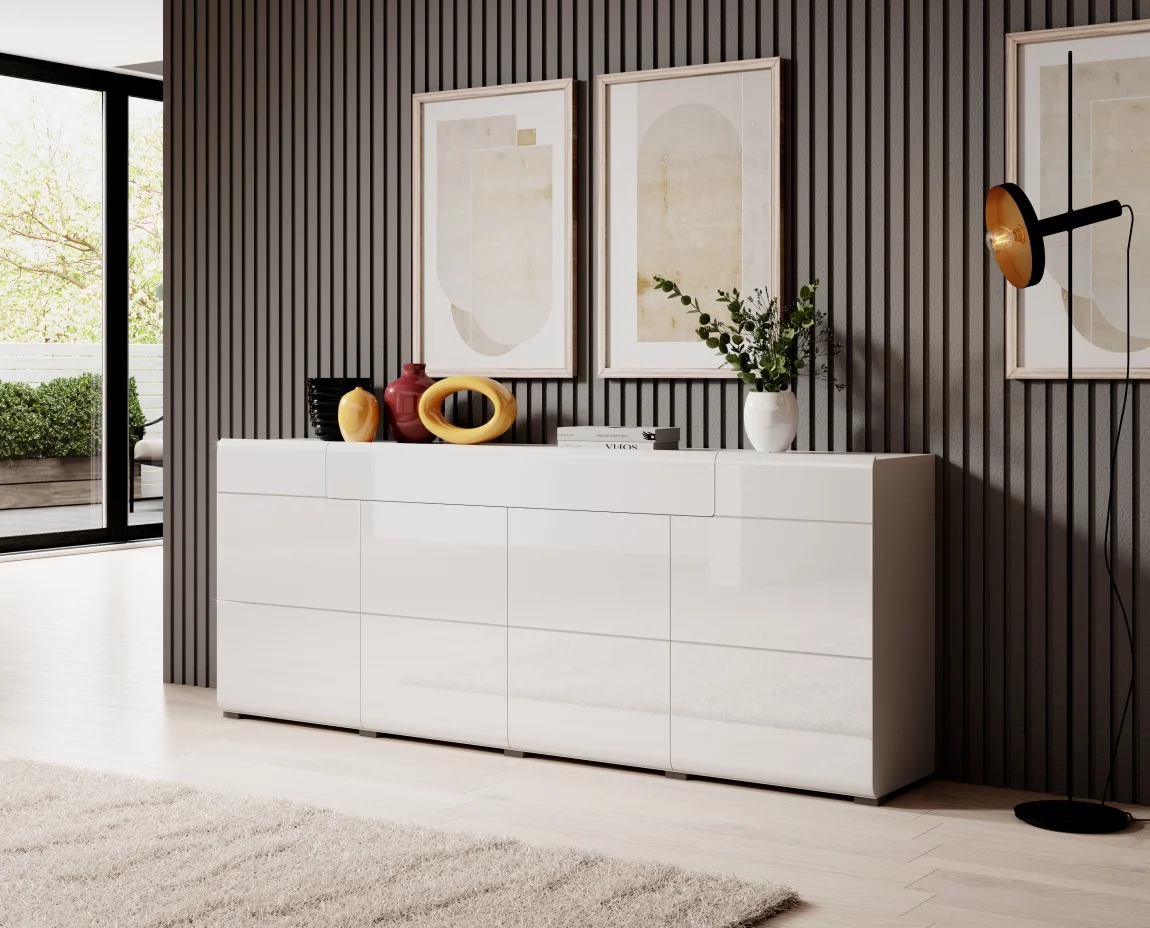 Stylová komoda HAMAL v provedení bílá s vysokým leskem dodá interiéru svěží a moderní vzhled. Její rozměry 208 cm šířky x 39 cm hloubky x 83 cm výšky poskytují dostatek úložného prostoru a zároveň nezatěžují místnost.