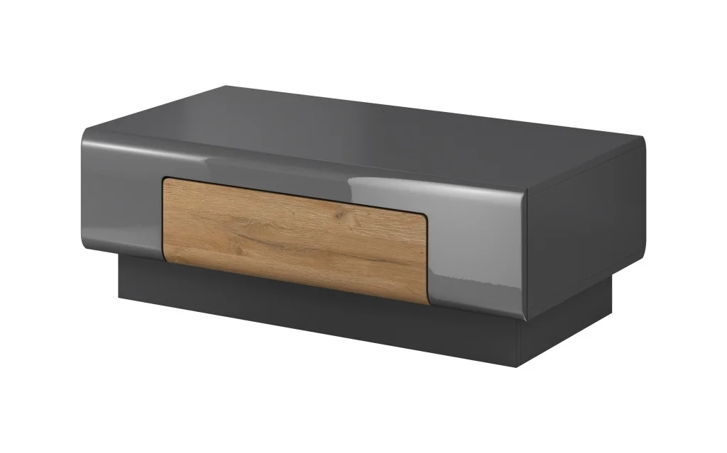 Konferenční stolek HAMAL kombinuje matný a lesklý antracit s dekorem dub Grandson, čímž vzniká moderní a nadčasový vzhled do obývacího prostoru. Rozměry: 110 × 39 × 60 cm zajišťují dostatek místa pro nápoje, ovladače a dekorace.