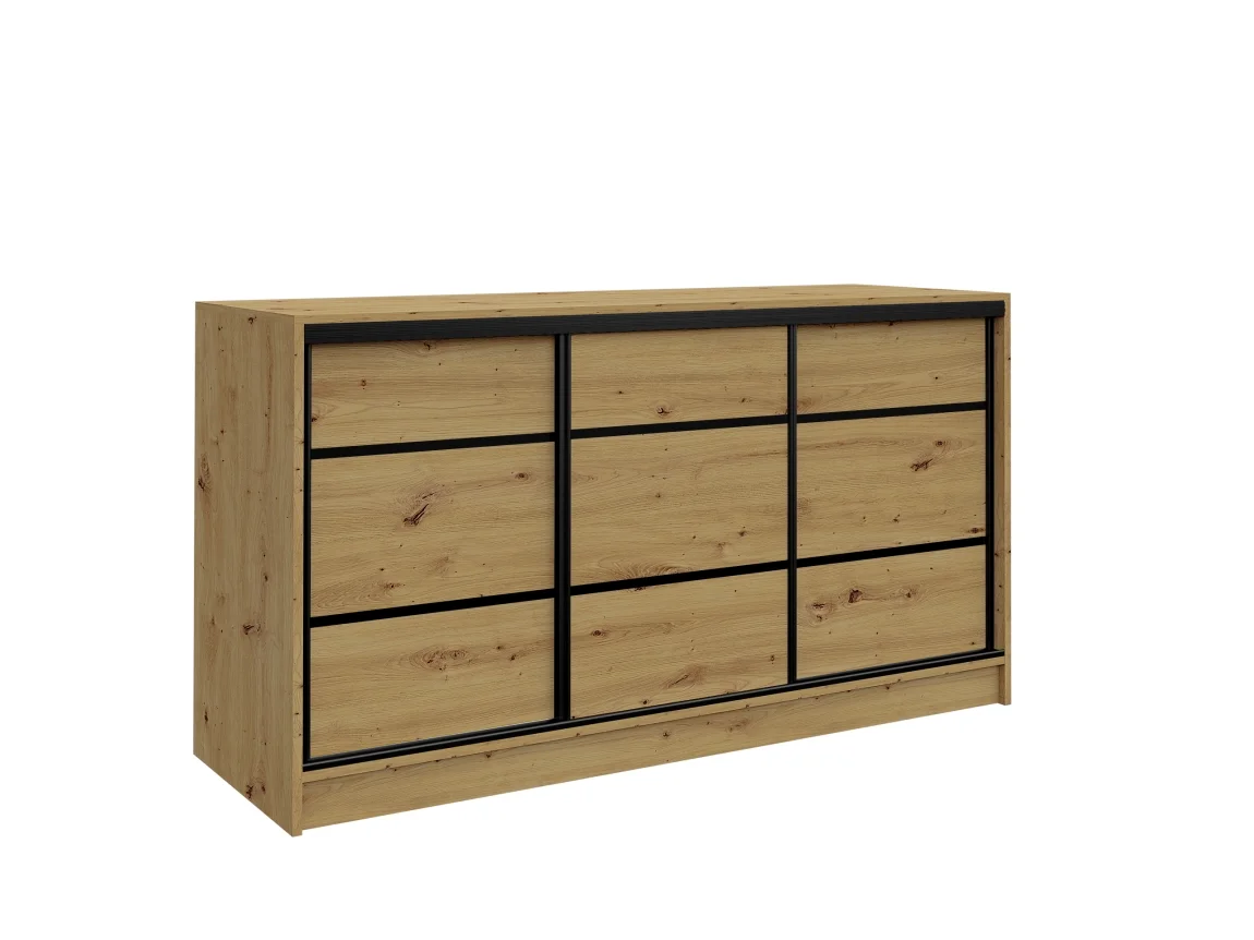 Kombinovaná šatní komoda s posuvnými dveřmi nabízí efektivní řešení pro uspořádání oděvů. Rozměry (š × v × h): 160 × 97 × 56 cm. Povrch je vyroben z lamina v dekoru dub artisan, což zaručuje dlouhou životnost a snadnou údržbu.