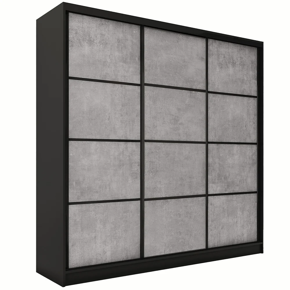 HARAZIA 180 bez zrcadla je praktická šatní skříň s posuvnými dveřmi, která nabízí efektivní využití prostoru. Rozměry 180 × 205 × 56 cm a povrch v laminu v kombinaci černého matu a betonu dodávají moderní vzhled.
