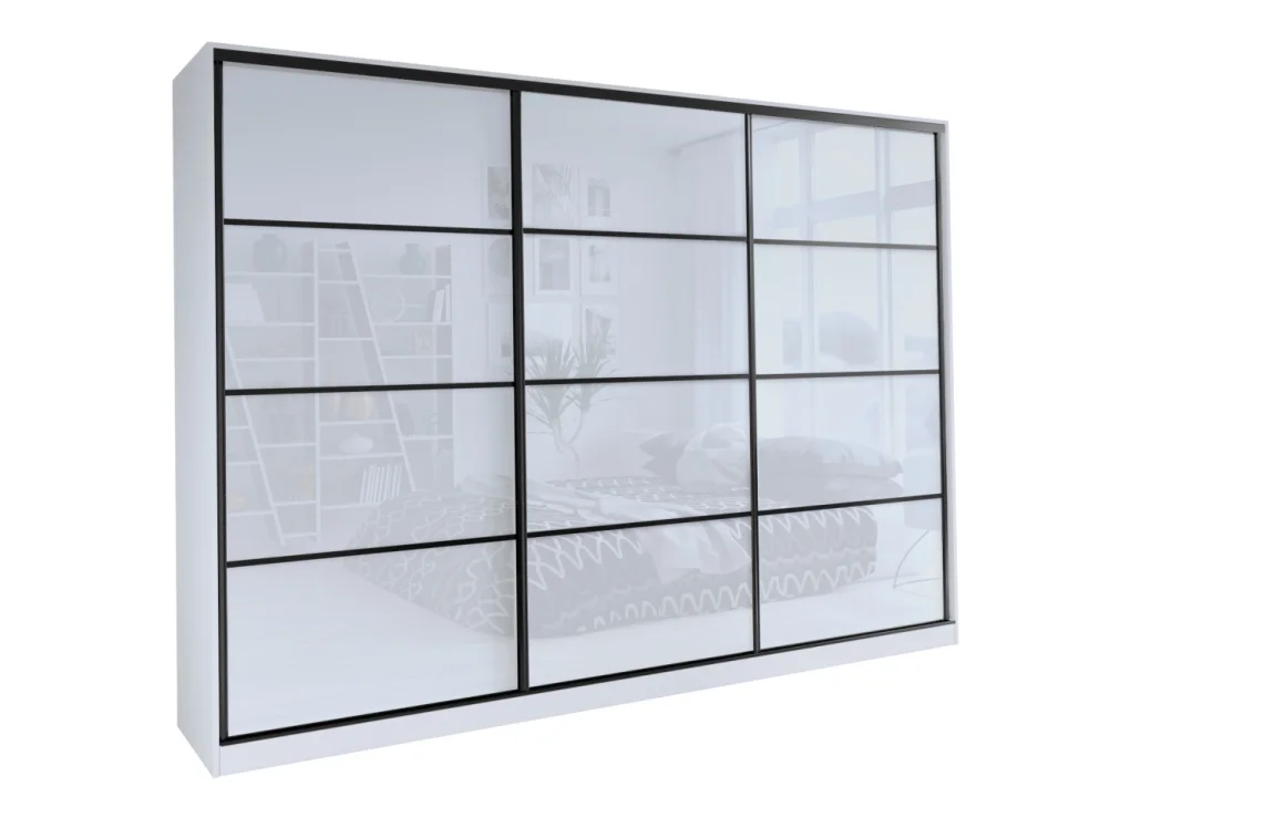 Kombinovaná šatní skříň HARAZIA 280 je řešena s posuvnými dveřmi a lze volitelně vynechat ozdobné lišty, aby vznikl hladký design bez rušivých prvků. Rozměry skříně jsou 280 x 205 x 56 cm (š x v x h) a povrch je proveden v bílém lesku.