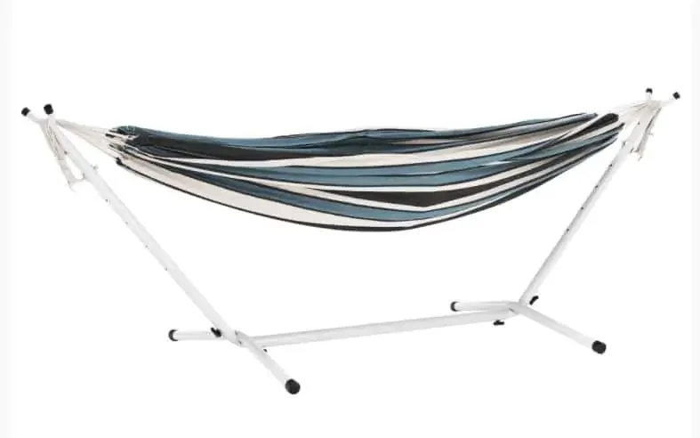 Houpací síť KABUKI je vyrobena z kombinace bavlny a polyesteru, která zajišťuje pohodlí a odolnost při odpočinku. Její modrý proužkovaný vzor dodává zahradě i terase svěží a hravý vzhled.