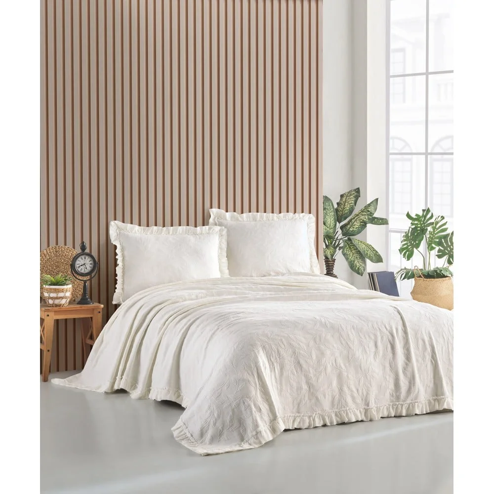 Elegantní krémový set na dvoulůžko o rozměrech 220x240 cm, který zahrnuje přehoz a povlaky na polštáře, je ideální volbou pro harmonický a útulný pokoj. Tento set nejenže dodá vaší ložnici sofistikovaný vzhled, ale také poskytne příjemný pocit pohodlí při každém použití.