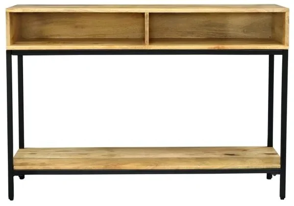Stylový konzolový stůl Gita z masivního manga kombinuje přírodní vzhled s industriálním designem, ideální jako praktický a originální doplněk do vašeho interiéru. Tento odolný kus nábytku je perfektní volbou pro ty, kteří chtějí do svého domova vnést exotický nádech a rustikální atmosféru.