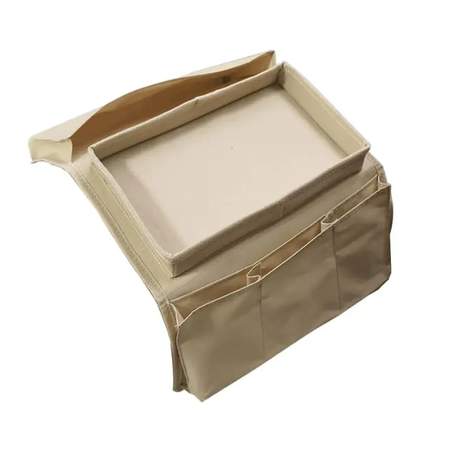IPRES organizér na pohovku je vyroben z 100% polyesteru a vyniká jemnou béžovou barvou, která se hodí do každého interiéru. Na jedné straně má tři malé kapsy a na druhé straně jednu velkou kapsu pro drobnosti, tablet či dálkové ovládání. Vrchní odkládací plocha slouží jako praktické místo pro kávu či nápoje, takže vše máte snadno po ruce. Rozměry činí 53 × 31 cm; šířka kapsy na tablet je 17,5 cm a šířka vrchní plochy 18,5 cm; výška odkládací plochy je 4 cm. Nosnost 5 kg zajišťuje stabilitu při běžném používání. Je kompatibilní s opěrkami o šířce do 18 cm; lze jednoduše složit a snadno přesouvat dle potřeby. Údržba je snadná – stačí otřít vlhkým hadříkem. V naší nabídce najdete i další odkládací či konferenční stolky, které doplní obývací prostor a podpoří pořádek. Díky neutrální béžové barvě působí elegantně a bude ladit s většinou sedaček a dekorací, ať už máte moderní nebo tradiční interiér.