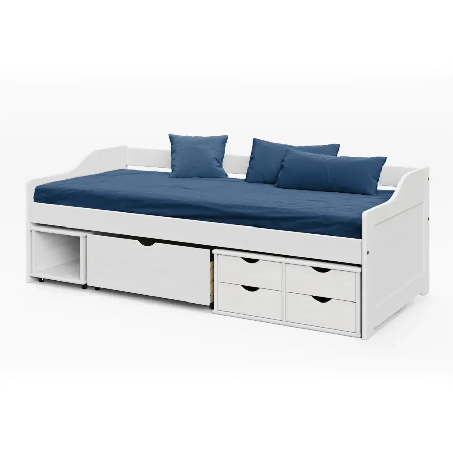 Jednolůžková postel MAXIMA je vyrobena z masivní borovice s bílým mořením, které dodává nábytku svěží a nadčasový vzhled. Pod postelí je zabudovaný úložný systém s praktickými zásuvkami, jejichž hloubka činí 39 cm. Výška sedu 50 cm přispívá k pohodlnému vstávání i posazení. Postel se dodává s dřevěným laťkovým roštem; matrace ani dekorace nejsou součástí balení. Doporučená velikost matrace je 90 × 200 cm. Dodáváno v demontu, což usnadní dopravu i montáž. Díky neutrální bílé úpravě se hodí do každého stylu ložnice a snadno ji sladíte s dalším nábytkem.