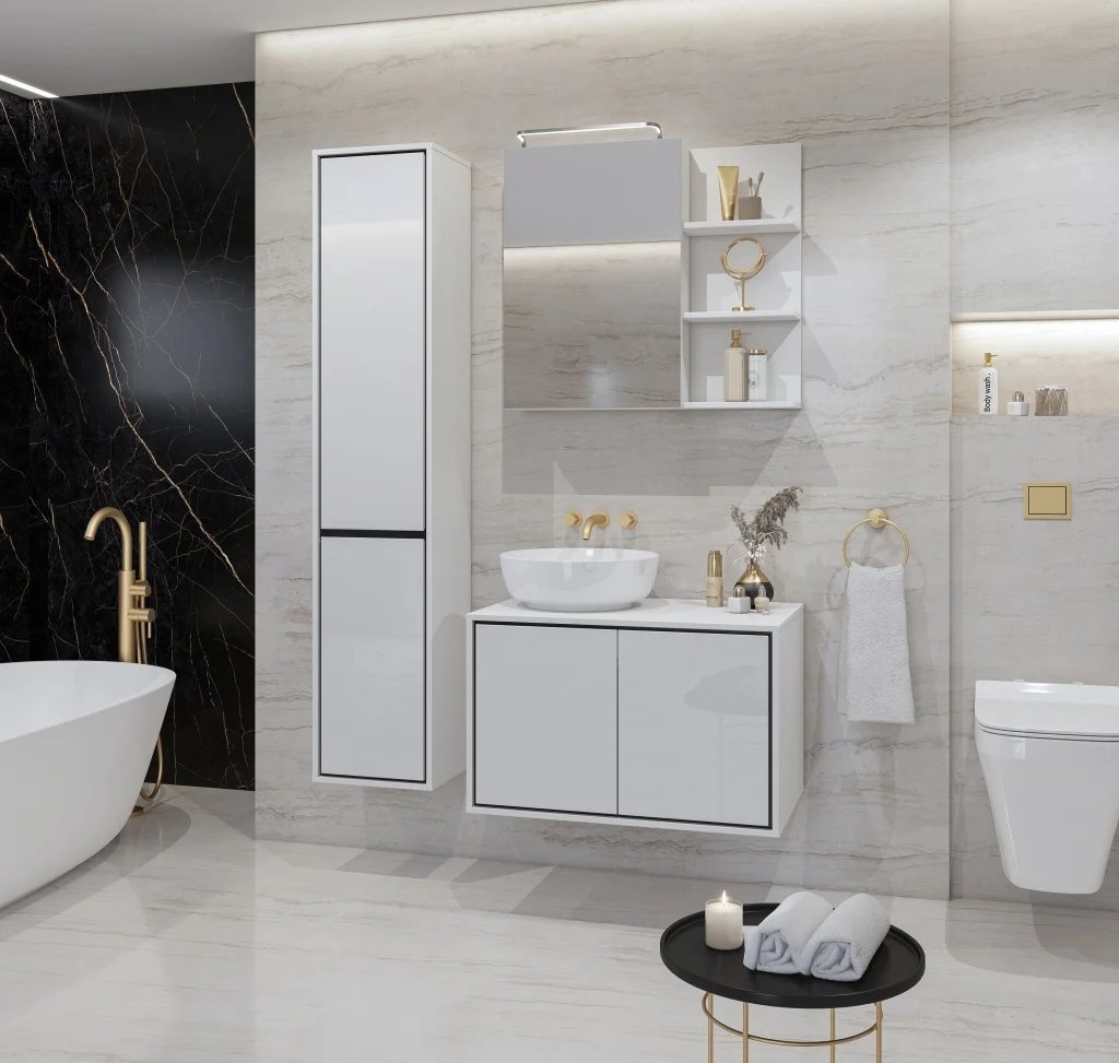 Korpus má provedení bílo-černý onyx a dvířka v bílem lesku. Materiál: lamino 15 mm pro korpus a MDF 16 mm pro dvířka. Sestava se dodává v demontu a neobsahuje umyvadlo ani osvětlení.
