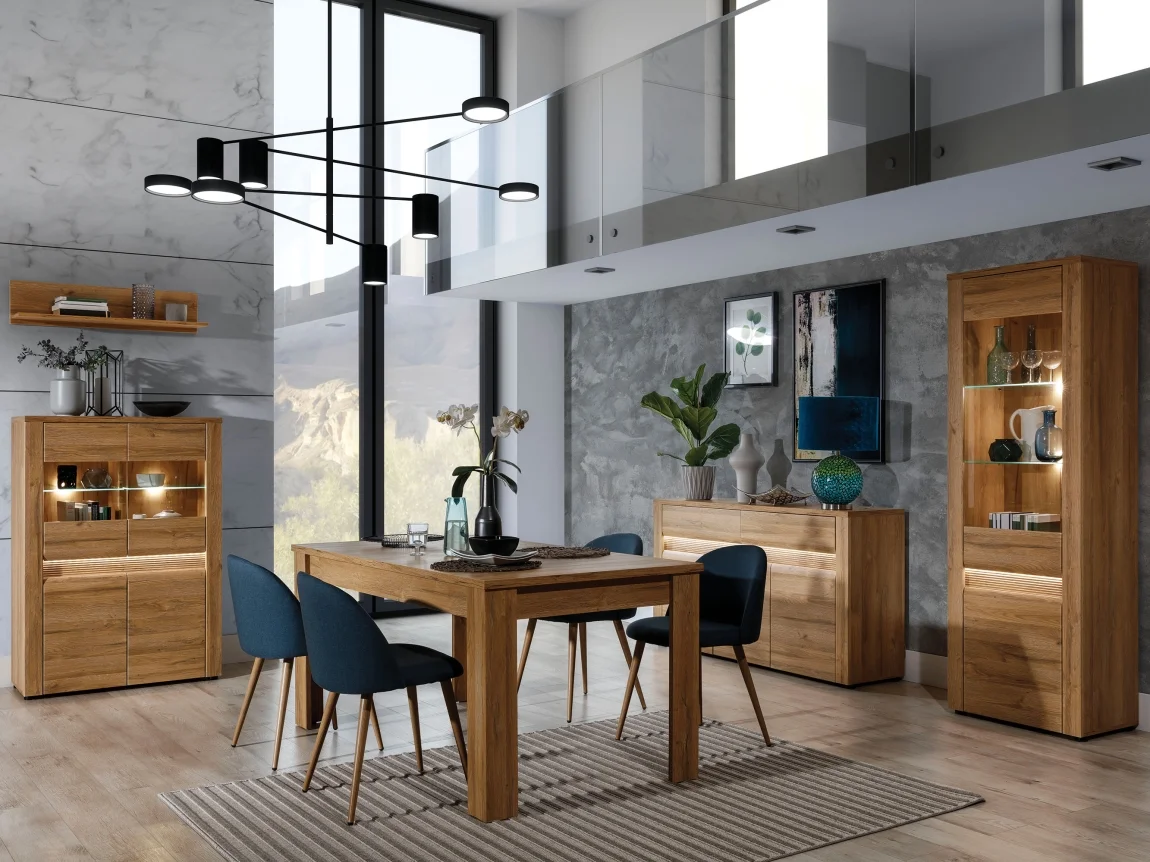 Bezúchytový systém otevírání dodává nábytku čistý a moderní vzhled, přitom LED osvětlení je součástí balení a zvýrazní detaily celého setu. Rozměry jednotlivých prvků: rozkládací jídelní stůl 90 × 76 × 160–200 cm, vitrína 63 × 193 × 40 cm, prosklená komoda 91,5 × 132 × 40 cm, komoda 150 × 86 × 40 cm, police 91,5 × 22 × 23 cm. Materiál: lamino a MDF, nohy z plastu. Dodání probíhá v demontu. Záruka 24 měsíců.