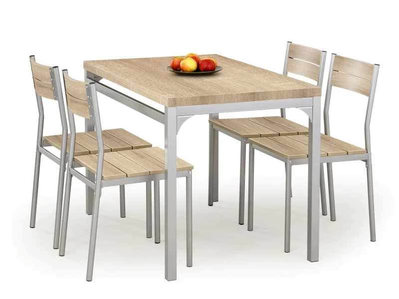 Jídelní set BENGUL zahrnuje stůl a čtyři židle v elegantní kombinaci dub sonoma a kovu. Stůl má horní desku z laminované desky a rám z lakované oceli, což zajišťuje pevnost a dlouhou životnost.