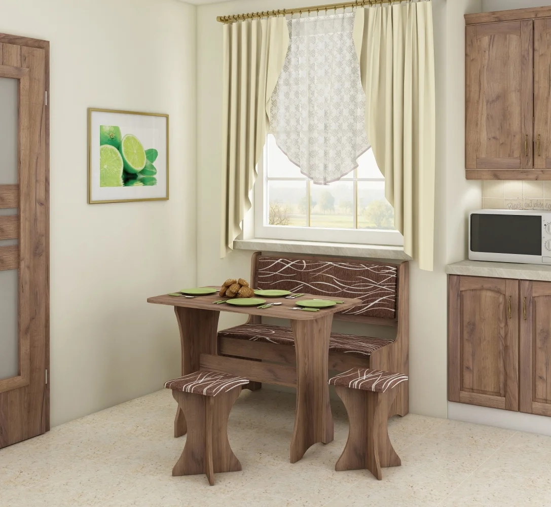 Jídelní set BUREWALA nabízí kompaktní a praktické řešení pro jídelní koutek v každé domácnosti. Součástí soupravy je lavice, stůl a dva taburety; barva provedení je craft tobaco a čalounění tvoří látka Safari.
