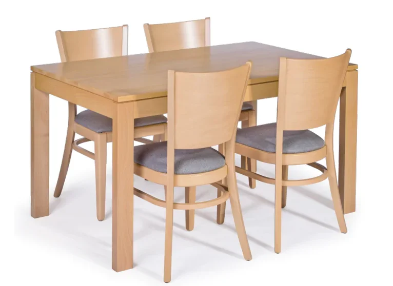 Nadčasový jídelní set tvoří stůl Callisto a čtyři židle Eliza a nachází uplatnění jak v domácnostech, tak v provozech. Deska stolu je z bukové dýhy o tloušťce 23 mm a spolu s masivními nohami z bukového dřeva zaručuje robustní pevnost a stabilitu. Židle Eliza nabízejí pohodlný čalouněný sedák pro komfortní sezení. K dispozici je několik variant dřeva a čalounění, takže si můžete vybrat tón i látku podle stylu interiéru. Rozměry stolu jsou 140 × 85 × 75 cm; deska 23 mm buková dýha, nohy a rám z masivu buk o průřezu 8 × 4,5 cm. Židle Eliza měří celkovou výšku 89 cm, výšku sedu 49 cm, šířku sedáku 43 cm a hloubku 40 cm; materiál masiv buk a nosnost až 130 kg. Termín dodání se může lišit v závislosti na vybraném odstínu dřeva a barvě látky čalounění. Objednejte si moderní jídelní set, který spojuje eleganci a dlouhou životnost.