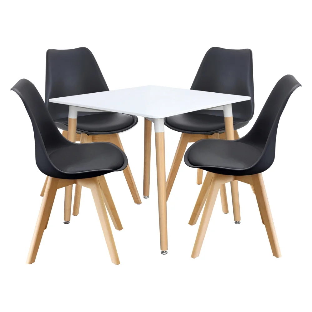 Jídelní set FARUK nabízí stůl a čtyři židle TALES v elegantní bílo-černé kombinaci. Rozměry stolu: 80 × 74 × 80 cm (š × v × h). Deska stolu je vyrobena z MDF, nohy z masivu a jsou vybaveny nastavitelnými plastovými kluzáky s chromovanou krytkou pro lepší stabilitu.