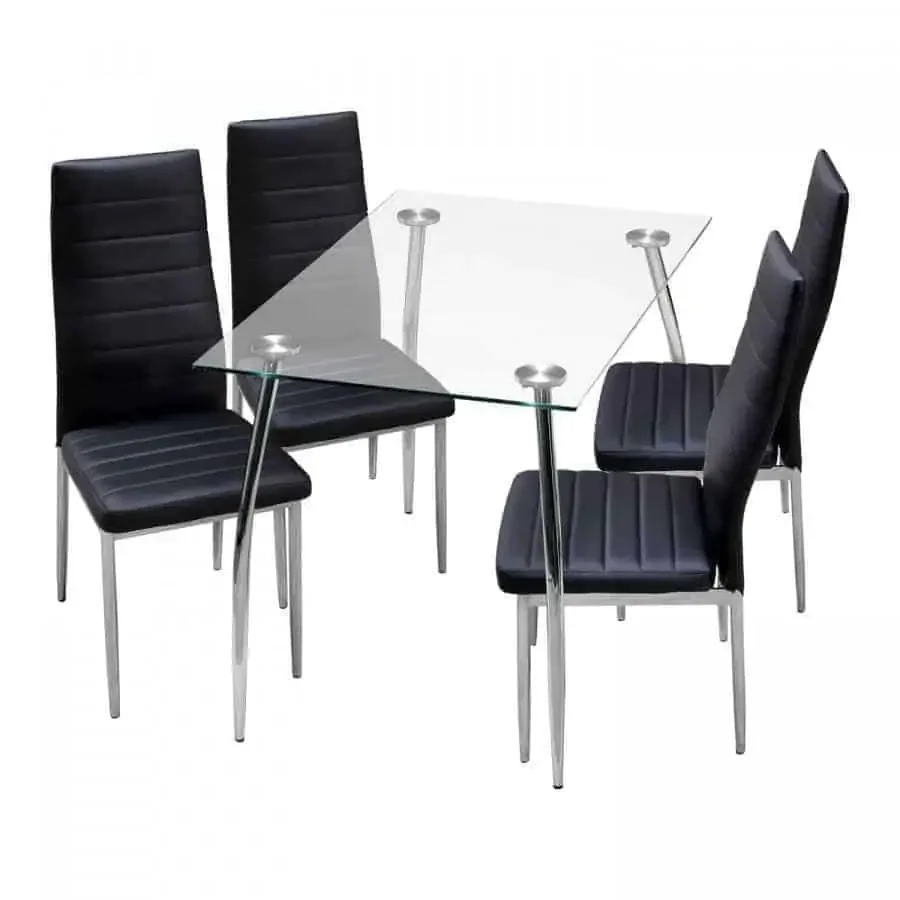 Stylový jídelní set obsahuje čtyři židle Miláno a obdélníkový stůl Granada. Kovový stůl má pevnou nerozkládací konstrukci a desku z čirého tvrzeného skla s chromovanými nohami. Židle mají chromované nohy a potah z imitace kůže v černé barvě; sedák i opěrák působí elegantně a pohodlně, výška sezení činí 46 cm. Rozměry stolu: 110 × 70 × 74 cm; rozměry židle: 41 × 40 × 98 cm. Zboží je dodáváno v demontu. Prohlédněte si jeho nadčasový vzhled, který skvěle doplní jídelní kout i moderní kuchyni. Díky odolným materiálům a precizní konstrukci je set vhodný pro každodenní použití a snadno se udržuje.