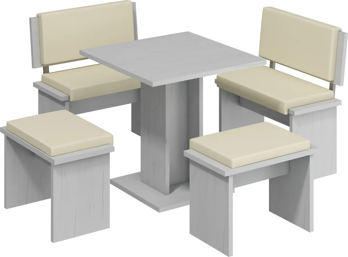 Jídelní set GURLAN je ideální volba pro malé jídelní kouty, kde kombinuje svěží vzhled craft bílé s béžovou ekokůží. Sada obsahuje dvě lavice, malý stůl a dva taburety, které dohromady vytvoří praktický jídelní nábytek pro děti i rodiče.