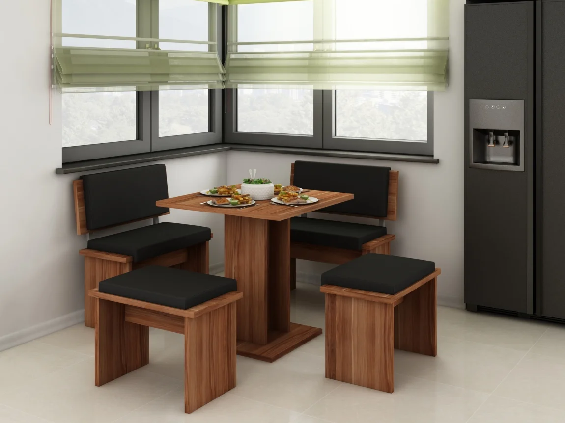 Jídelní set GURLAN Mini je kompaktní volba pro malé jídelní kouty. Povrch v odstínu švestka doplňuje černé čalounění z ekokůže a celý set působí stylově i prakticky. Konstrukce je provedena z lamina tloušťky 16 mm s ABS hranami 0,6 mm, což zvyšuje odolnost vůči každodennímu používání.