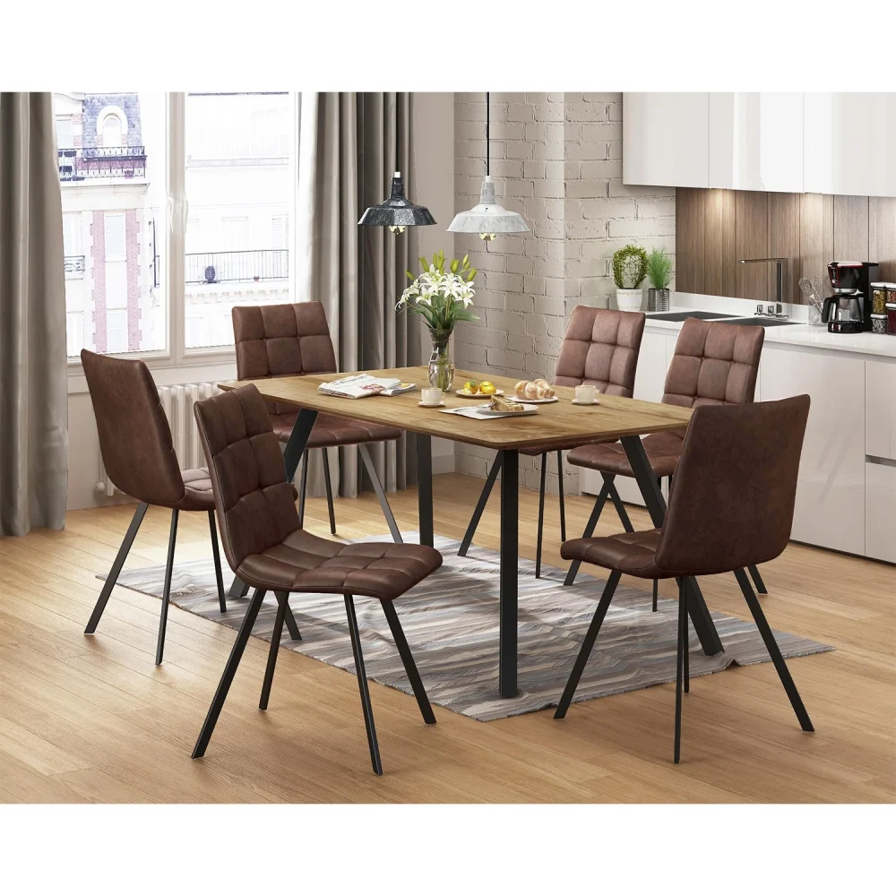 Jídelní set Kalina 1+6 kombinuje styl a dlouhodobou odolnost. Sestává ze stolu o rozměrech 140 × 75 × 80 cm a šesti židlí, jejichž rozměry jsou 55 × 88 × 45 cm s výškou sedu 51 cm. Deska stolu je laminovaná a umístěná na kovové konstrukci, zatímco židle jsou čalouněné hnědým mikrovláknem, které je příjemné na dotek a snadno se čistí.