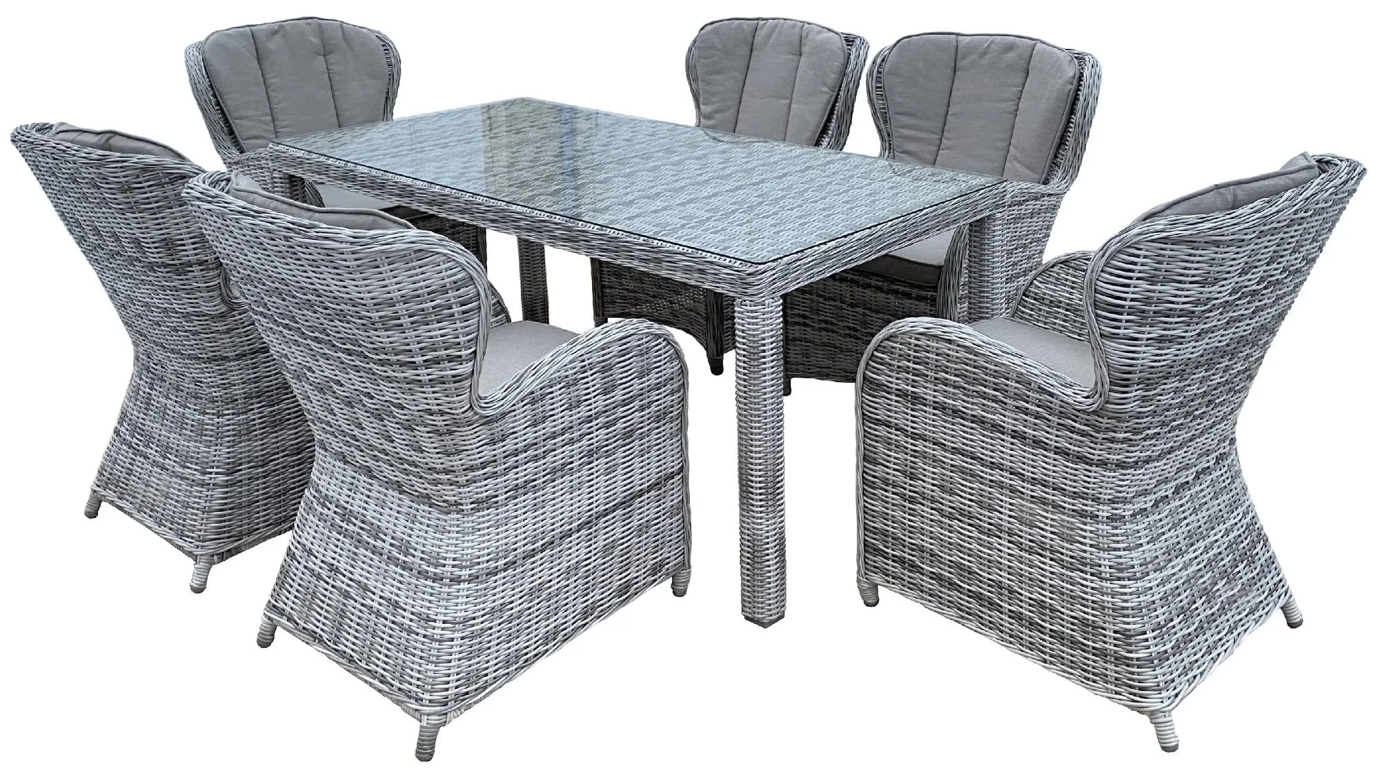 Elegantní a odolná zahradní jídelní sestava KATE z umělého ratanu je ideální pro rodinné obědy, večírky i oslavy na terase či v zahradě. Tento luxusní set obsahuje šest pohodlných židlí s polstrováním ve světlé šedé a mocca odstínu a prostorný stůl s tvrzeným sklem, který se snadno udržuje.