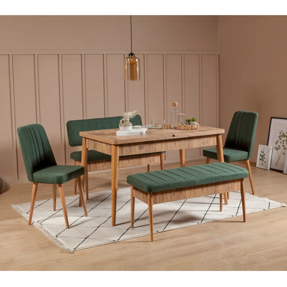 Deska stolu je vyrobena z melaminované dřevotřísky s odolným povrchem, což zajišťuje dlouhodobou odolnost vůči škrábnutí a snadnou údržbu. Kombinace borovice atlantské a zelené barvy dodává prostoru eleganci a svěží vzhled, který se hodí ke všem stylům interiéru. Nohy z habrového dřeva poskytují stabilitu a bezpečné stolování, rozkládací mechanismus stolu navíc umožní snadné rozšíření plochy pro hosty. Rozměry: stůl 130 x 77 x 80 cm (v rozloženém stavu 165 x 75 x 80 cm), židle 47 x 89 x 46 cm, lavice 110 x 48 x 40 cm, úložná jednotka 95 x 12 x 27 cm. Pro každodenní pohodlí a styl je REMDAL typ 2 skvělou volbou pro každou jídelnu, ať už plánujete každodenní rychlé večeře, nebo větší rodinné sešlosti.