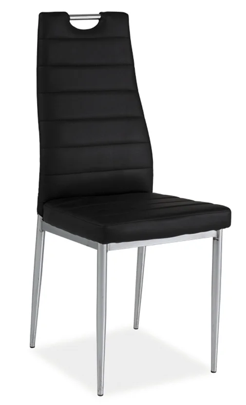 Představujeme čalouněnou jídelní židli GOMILA s prodlouženým opěradlem pro pohodlné posezení. Pochromovaná kovová konstrukce a černý potah z ekokůže dodávají židli moderní vzhled a dlouhou životnost.