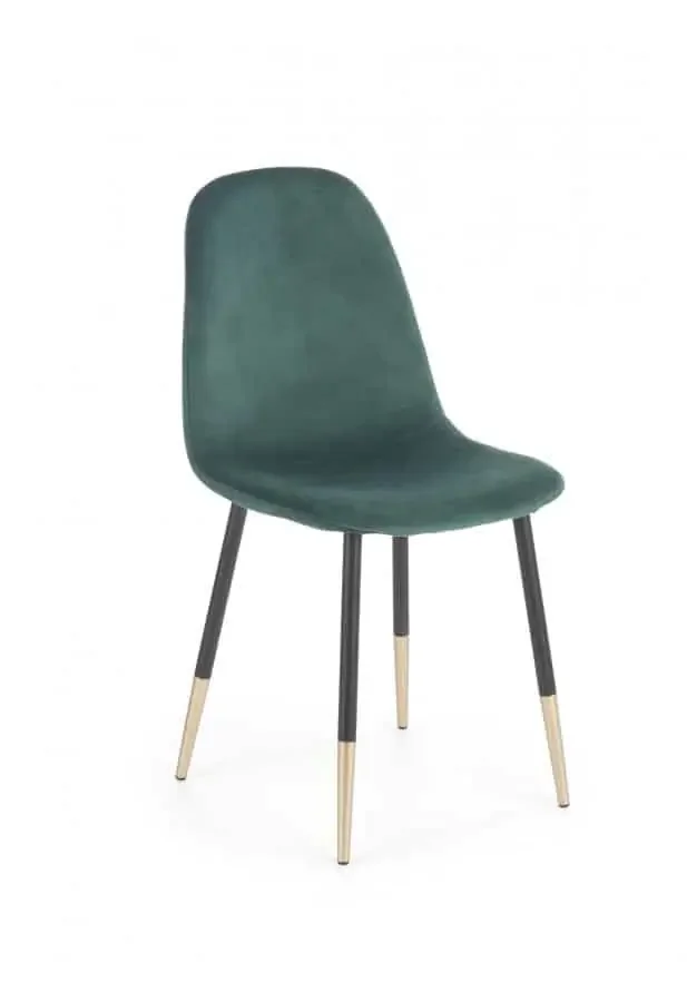 Moderní jídelní židle s elegantním vzhledem. Je čalouněná jemnou sametovou látkou Velvet v zelené barvě, která dodává interiéru nadčasový nádech. Stabilitu zajišťují kovové nohy z práškované oceli v černé barvě s elegantním zlatým zakončením, takže křeslo působí pevně a stylově. Dodává se v demontovaném stavu pro snadnou montáž. Díky kvalitnímu čalounění se skvěle hodí do jídelny i kuchyně a poskytuje pohodlné sezení i při delších chvílích u stolu.