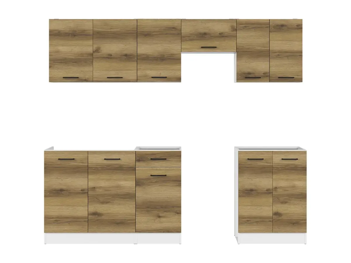 Vizuálně působí elegantně díky kombinaci bílých korpusů a světlého dubu Delano s grafitovými úchyty, které dodávají moderní vzhled. Upozornění: pracovní desky, elektrospotřebiče a dřez nejsou součástí sestavy a je nutné je pořídit zvlášť. Rozměry: šířka 230 cm; hloubky horních skříní 30,5 cm, spodních 47 cm; výšky horních 57,5 cm a spodních 82 cm. Díky modulární konstrukci Junona 230 cm nabízí flexibilitu a snadné přizpůsobení prostoru a stylu. S touto sestavou získáte nejen praktický úložný prostor, ale i nadčasový vzhled, který se hodí do mnoha kuchyňských interiérů.