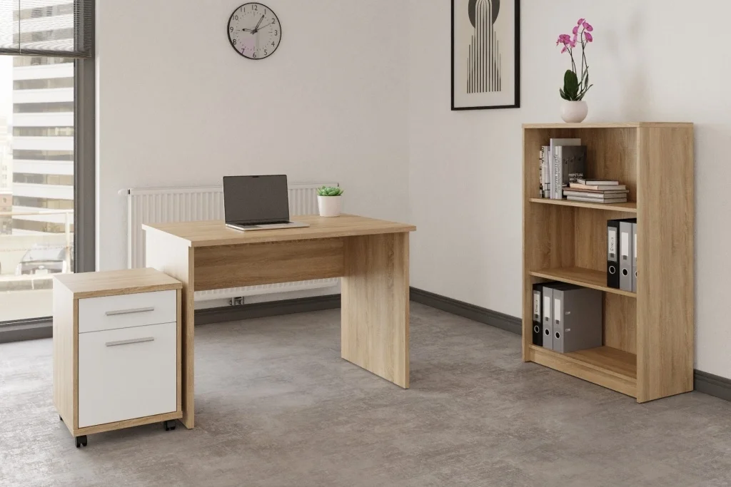 Tato kancelářská sestava GIANNI 10 přináší praktické uspořádání a reprezentativní vzhled, který zapadne do moderní kanceláře. Je složena z několika modulů, které lze libovolně kombinovat podle dostupného prostoru a potřeb uživatele. Barevné provedení v dubu sonoma s bílými akcenty působí svěže a nadčasově. Do sady patří: PC stůl 100 × 74 × 67,5 cm; nízký regál 72,5 × 115,8 × 33,8 cm; kontejner 38,2 × 55,9 × 41,4 cm. Materiál tvoří lamino a sestava se dodává v demontovaném stavu. Modulární uspořádání umožňuje flexibilní konfiguraci a snadné rozšíření o další prvky řady. Pořádek a funkčnost získáte díky praktickým přihrádkám a kompaktím rozměrům, které šetří prostor. Navíc je údržba jednoduchá a povrch je odolný vůči běžnému opotřebení, což z ní dělá spolehlivé zázemí pro každodenní práci.