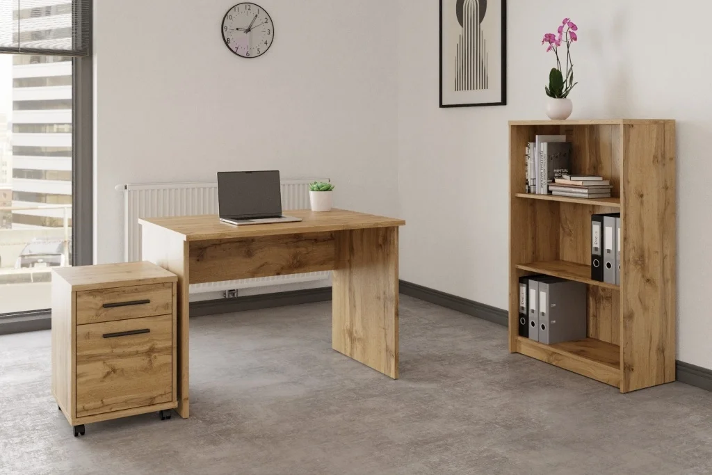 Gianni 10 v provedení dub wotan představuje praktickou a stylovou kancelářskou sestavu, která efektivně využije prostor i v menších pracovních koutcích. Díky modulárnímu systému si lze uspořádat pracovní zónu podle aktuálních potřeb a případně rozšířit nábytek o další díly ze stejné řady. Sestava zahrnuje: PC stůl o rozměrech 100 × 74 × 67,5 cm, nízký regál 72,5 × 115,8 × 33,8 cm a kontejner 38,2 × 55,9 × 41,4 cm. Povrch je z lamina v dekoru dub wotan, který působí příjemně a je odolný vůči opotřebení. Dodáváno v demontu, což usnadňuje dopravu a montáž a umožní rychlé uvedení do provozu. Navíc modulární konstrukce umožňuje flexibilní uspořádání i do budoucna, pokud budete chtít změnit uspořádání pracovního prostoru.
