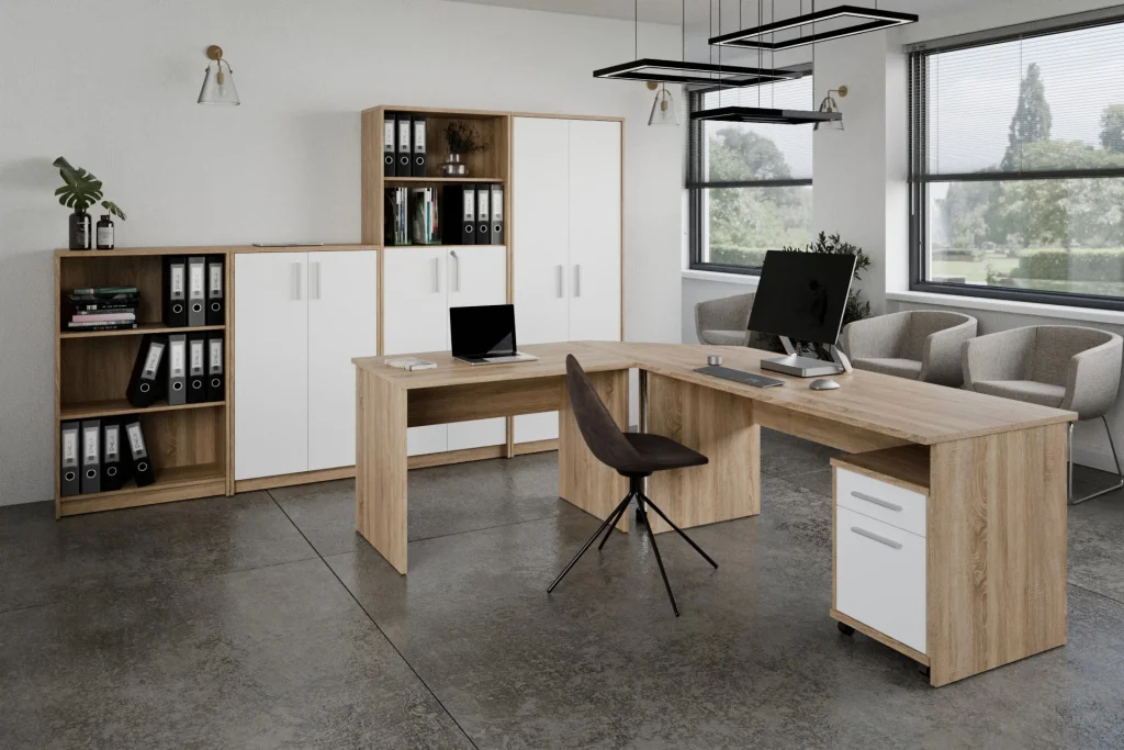 Modulární kancelářská sestava GIANNI 11 v provedení dub sonoma/bílá je ideálním spojením funkce a estetiky. Modulární systém umožňuje variabilní uspořádání podle vašeho prostoru a potřeb, díky čemu snadno dosáhnete pořádku i reprezentativního vzhledu. Sestavu tvoří několik prvků, které lze kombinovat: nízký regál 72,5 x 115,8 x 33,8 cm, skříňka 72,5 x 115,8 x 33,8 cm, uzamykatelná skříň 72,5 x 186,2 x 33,8 cm, další skříň 72,5 x 186,2 x 33,8 cm, kancelářský PC stůl 100 x 74 x 67,5 cm, rohový prvek 67,5 x 74 x 67,5 cm, psací stůl 147,8 x 74 x 67,5 cm a kontejner 39 x 55,9 x 41,4 cm. Laminovaný povrch je odolný vůči opotřebení a snadno se udržuje. Dodáváno v demontu, ale díky jasnému návodu zvládne montáž každý. Další výhoda spočívá v tom, že díky promyšlené konfiguraci se sestava hodí jak do menších, tak do větších kanceláří a efektivněji roztřídí pracovní prostor.