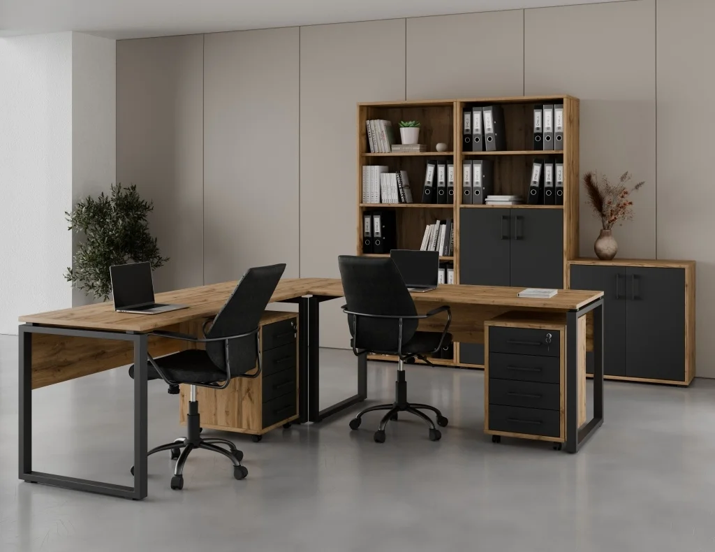 Předložená ukázka ukazuje jednu z možných konfigurací kancelářského prostoru složeného z jednotlivých dílů, které nabízíme i samostatně. K sestavě patří psací stůl o délce 150 cm, dále rohové spojovací prvky pro propojení stolů (65 cm šířky, 2,2 cm tloušťky a 65 cm výšky), uzamykatelný kontejner ve dvou kusech (41,6 × 63 × 50 cm).